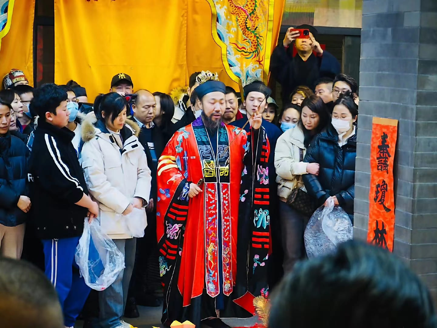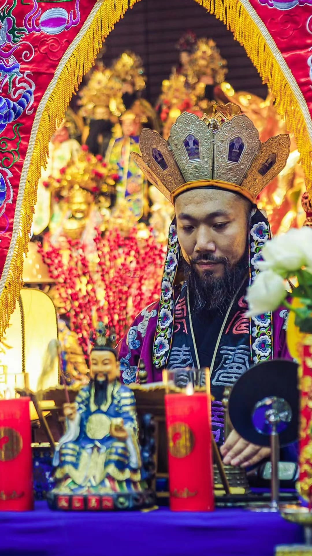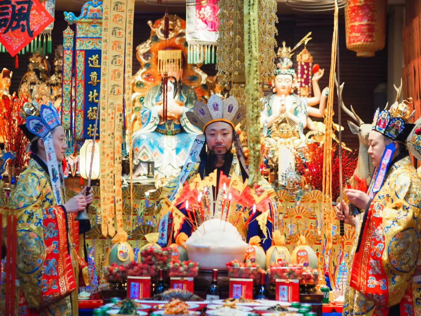 Master Lu conducts a communal ritual during a deity's birthday celebration, guiding participants in themed ceremonies to invoke blessings and spiritual harmony for all involved.