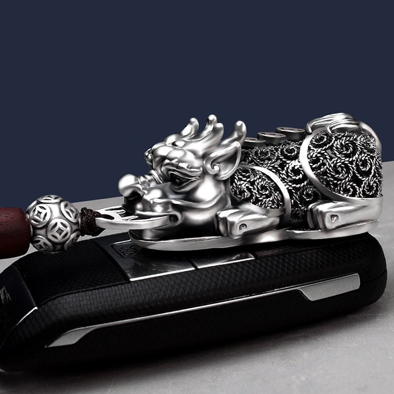 In Chinese mythology, Pixiu is a mythical beast revered as a powerful guardian of wealth. Said to consume gold and silver without expelling them, it represents accumulation, retention, and protection of fortune. This brass Pixiu keychain symbolizes: