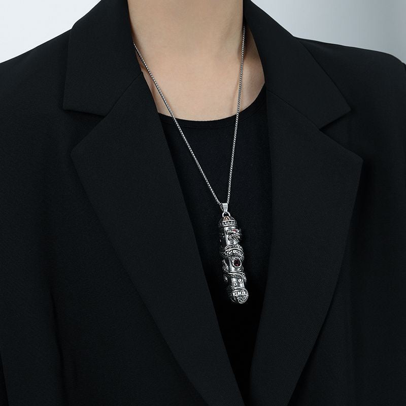 The Dragon Pillar Pendant draws inspiration from traditional Eastern symbolism and protective talismans. Sculpted with intricate scales and flame motifs, the pendant features a coiling dragon, an ancient emblem of power, guardianship, and transformation winding around a celestial pillar. Embedded with crimson red and garnet-colored stones as the dragon’s eyes, this design captures an aura of fierce energy and mystic clarity.