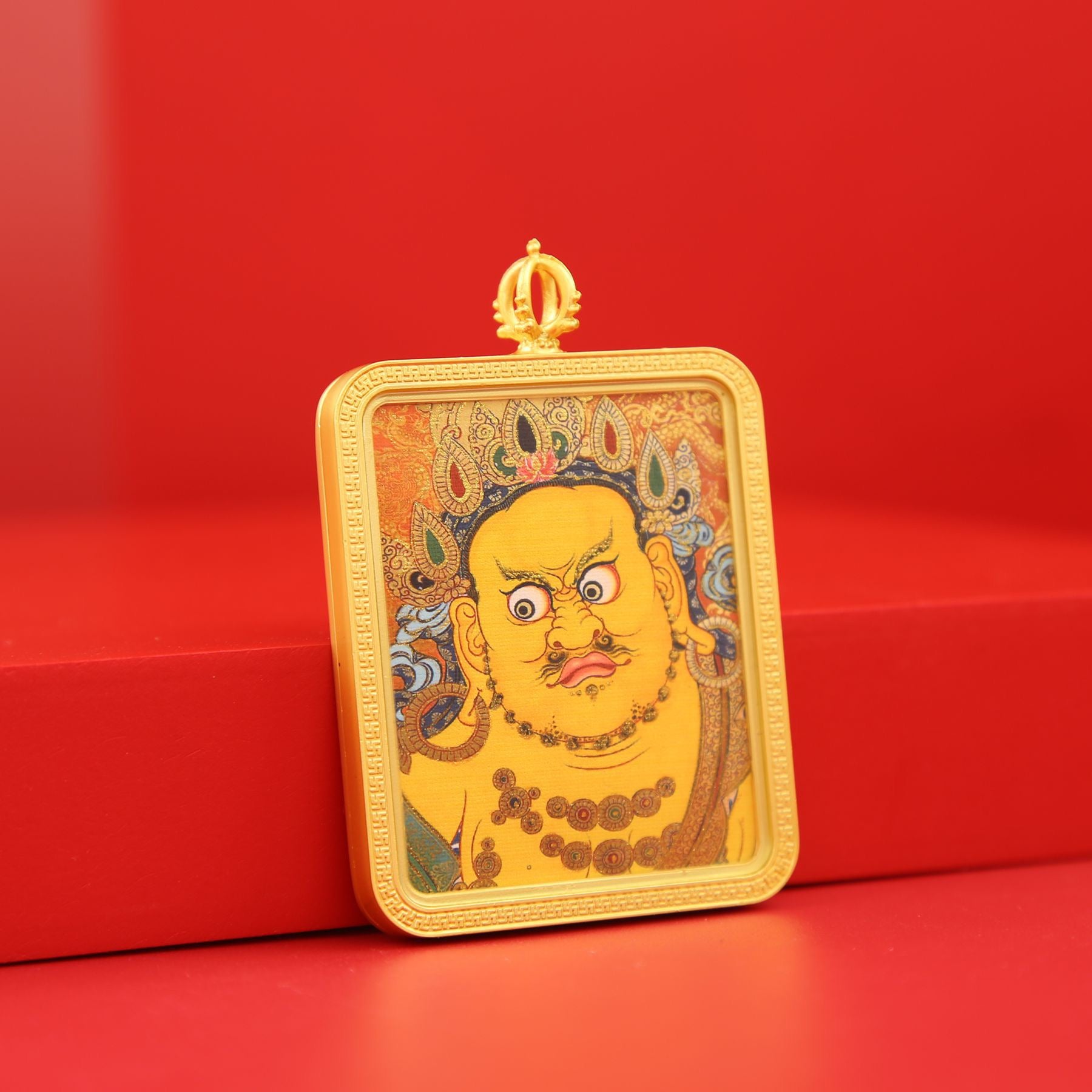 This pendant honors Yellow Jambhala (黄财神), the Tibetan deity of wealth and generosity. His image, depicted in radiant gold tones, seated majestically upon a snow lion, is surrounded by clouds, fire, and treasure emblems, evoking both power and benevolence. The reverse side features a richly colored wrathful protector thangka, reinforcing themes of protection and karmic purification.
